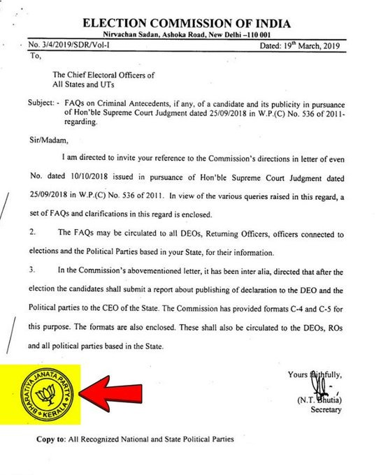 Bengaluru: That an official communication from the country’s supposedly independent institution conducting supposedly free and fair elections would carry the seal of the ruling party is an indicator of two things: incompetence or complicity. In the case of India’s Election Commission, there is ample and growing evidence that it is guilty of both.